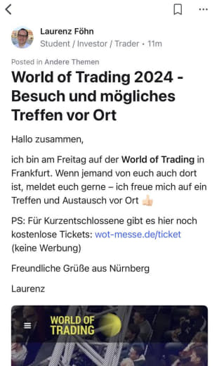 Ab Dienstag füge ich unter „Seminare / Hauptbühne / Emittentenbühne) die Vorträge des jeweiligen Tages ein (vorher macht keinen Sinn, da später eintreffende Teilnehmer die nicht sehen würden). Wenn ihr einen Vortrag besuchen wollt, markiert ihr ihn mit „👍🏻“. So können wir uns im Hintergrund zusammenfinden und mit den Menschen gezielt verabreden, die die gleichen Veranstaltungen besuchen möchten.